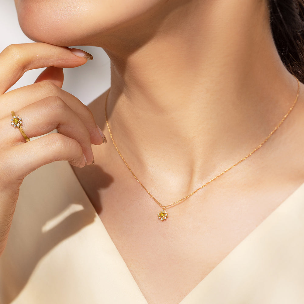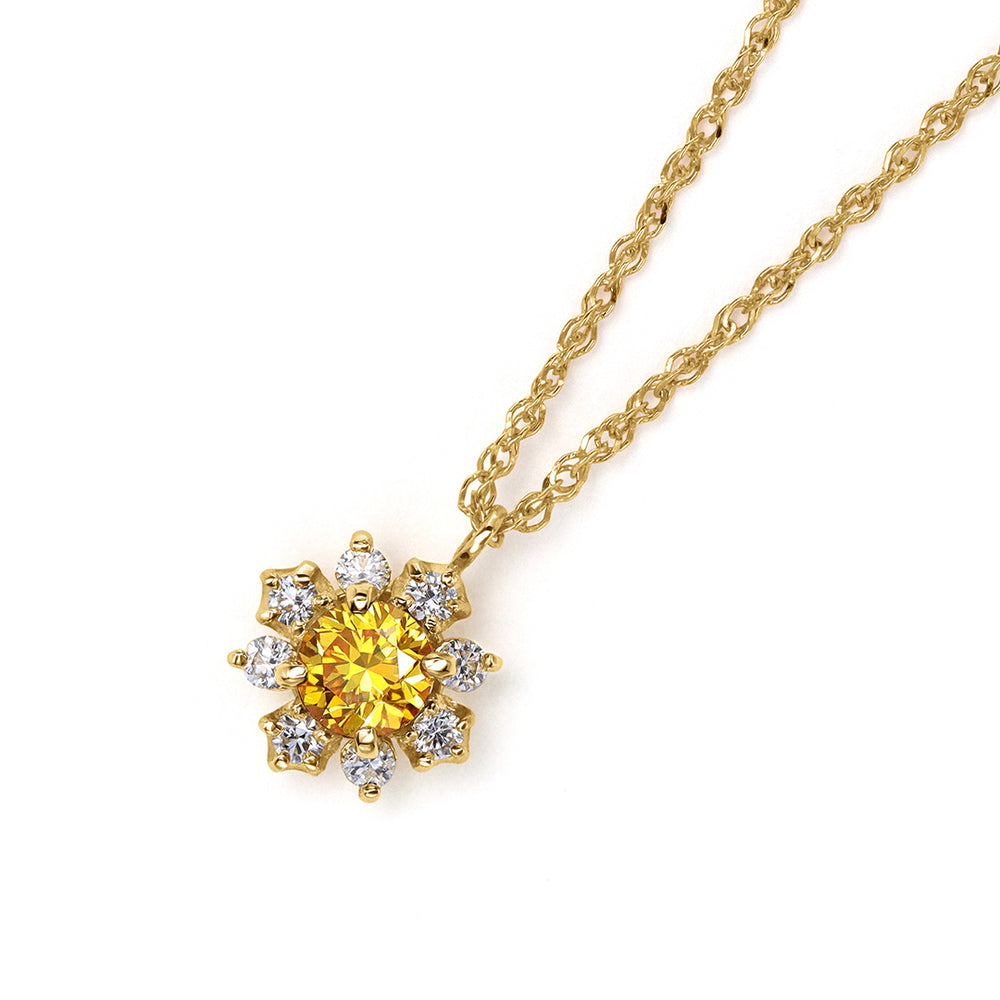 イエローダイヤモンドはその光の反射にも特筆すべき特性を持っています。その高い屈折率により、日光を浴びると鮮やかな輝きを放ち、室内では微かな灯りを取り込みながらも独特の光を湛えます。この光の特性は、まるでデコルテに咲く一輪の花のように、装いを華やかに引き立たせます。